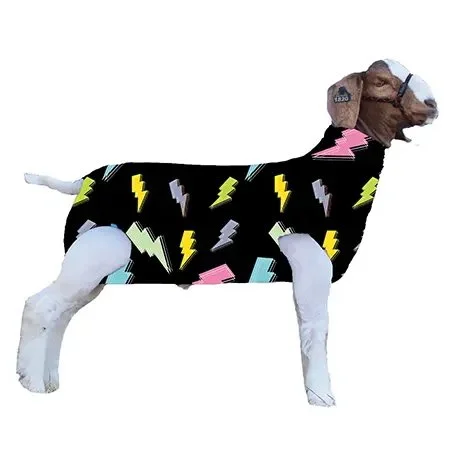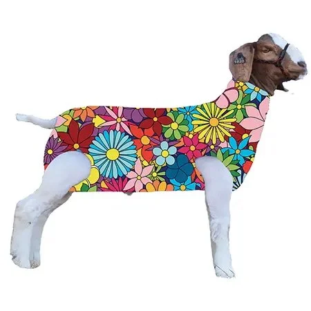 A special stretch tube specifically size fitted and tailored for goats. Keeps goats clean until show time. Material is 85% nylon, 15% lycra spandex. Machine washable.